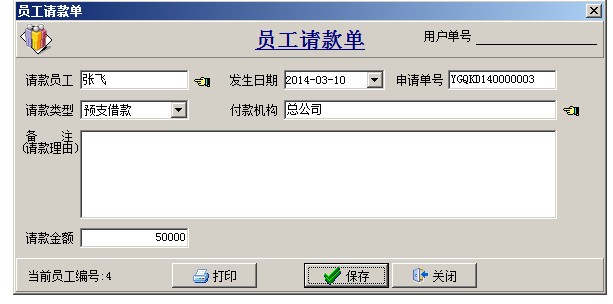 員工請款單可以開啟使用多級審核,審核之后執行付款,生成員工借款單,保存