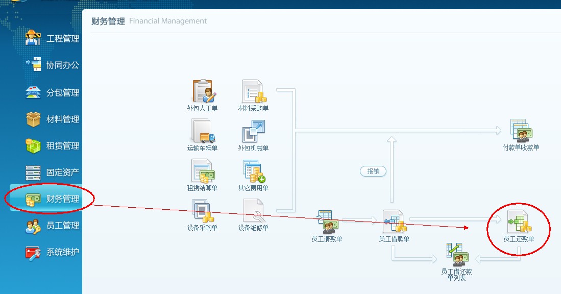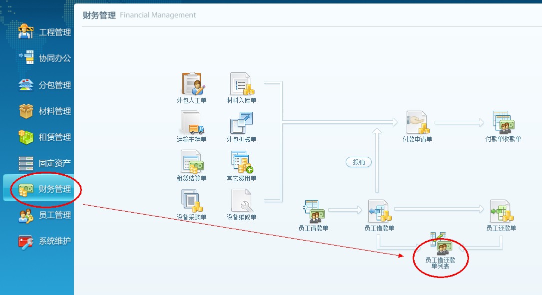 4、下面查詢一下業務員借款,點擊財務管理,打開員工借還款單列表