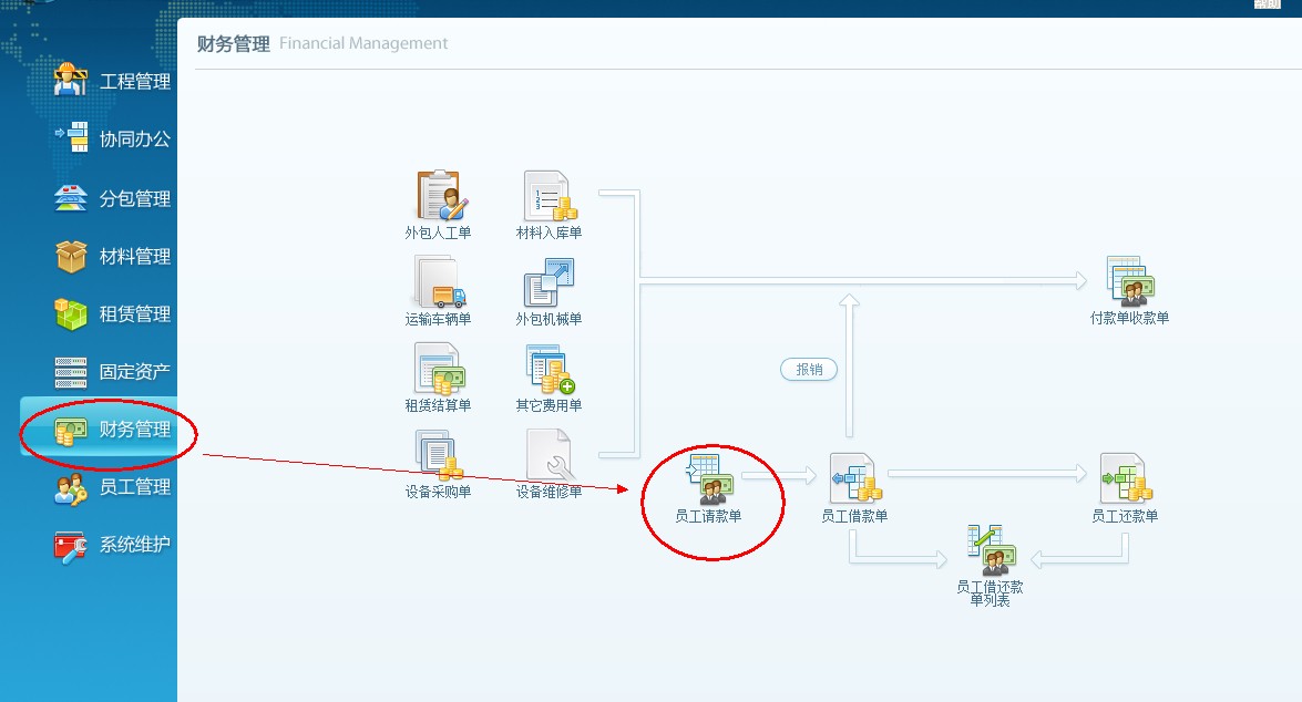 先做員工請款單(借款單的控制單據),打開財務管理模塊,員工請款單