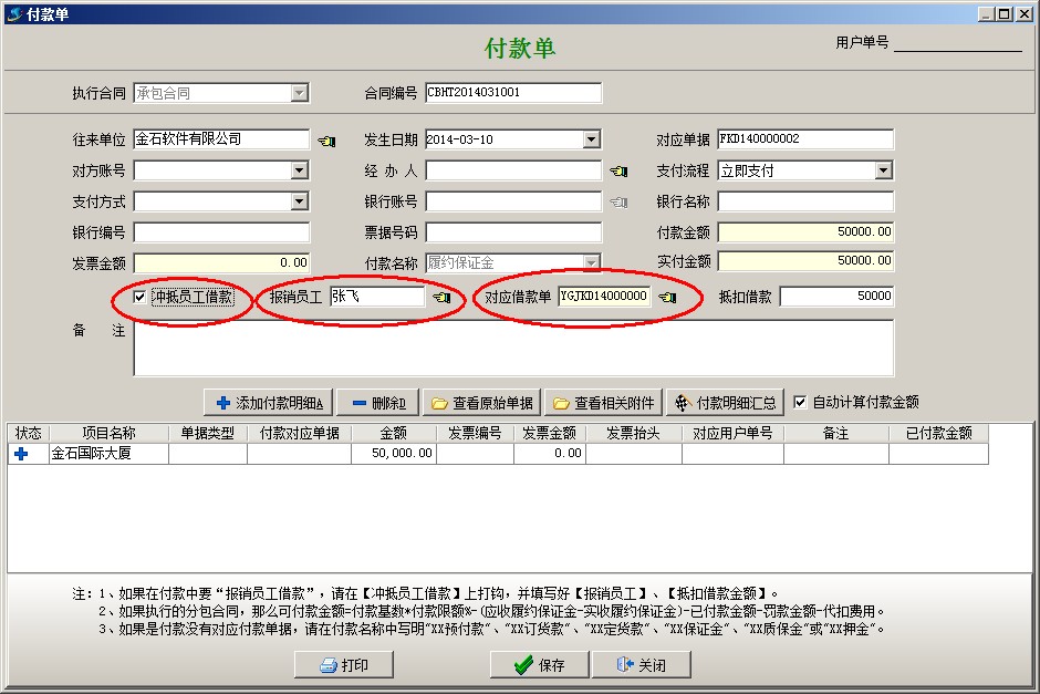 (3)最后做付款單沖抵員工借款,把當時交納的保證金報銷出來。