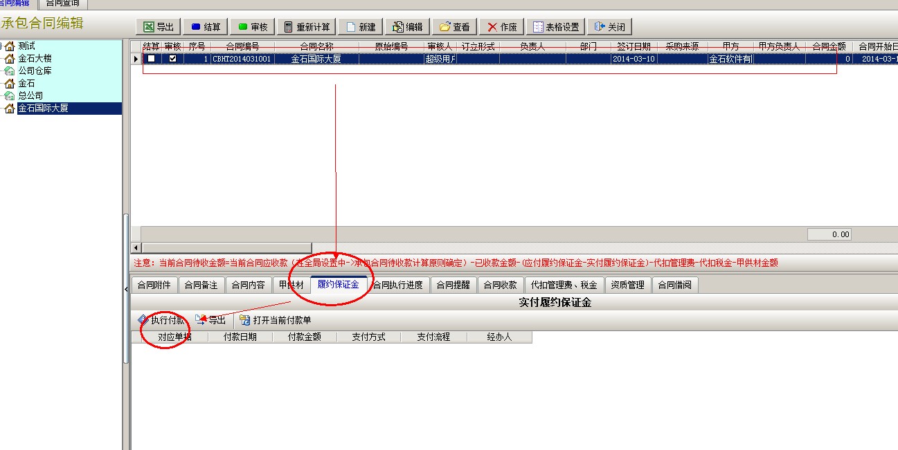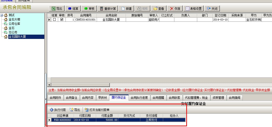 選中新建的合同,點擊下面執行功能中的履約保證金,點執行付款,彈出付款單